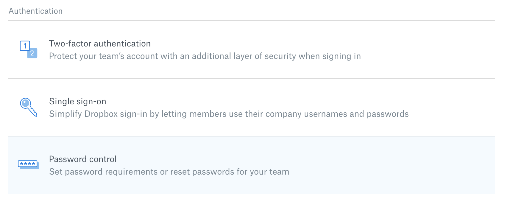 SSO を設定すると、一部の Dropbox セキュリティ機能(2 段階認証やセルフサービス パスワード リセットなど)は機能しなくなります。
